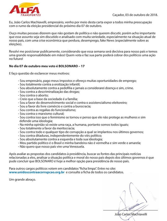O empresário caçadorense, João Carlos Machiavelli, proprietário da empresa Alfa Transportes, uma das maiores do ramo no país, emitiu na tarde desta quarta-feira, 3 de outubro, uma nota oficial se posicionando em favor do candidato Jair Messias Bolssonaro, do PSL, que concorre com o número 17, ás eleições presidenciais do Brasil, no dia 7 de outubro. No documento, ele expõe as razoes pela qual defende as ideias do candidato que aparece em primeiro nas pesquisas de intenção de voto.
