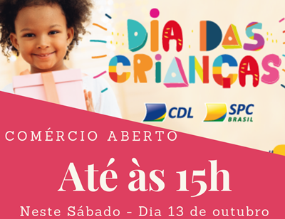 Com o objetivo de informar o consumidor e ajudar nas vendas do comércio, a CDL (Câmara de Dirigentes Lojistas) divulga que neste sábado, dia 13 de outubro, as empresas associadas estarão atendo seus clientes até às 15h.