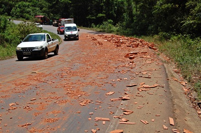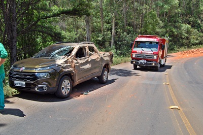 De acordo com informações, o caminhão seguia em direção a Caçador e ao contornar a referida curva acabou a carga pendeu e uma das cintas que segurava a carga acabou estourando, fazendo com que parte da carga atingisse a caminhonete que fazia o trajeto contrário.
