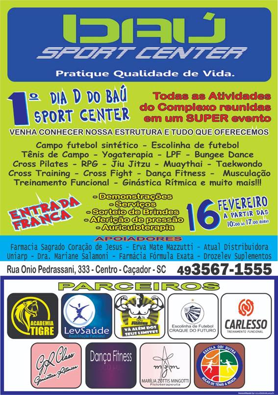 “Convidamos toda a população de Caçador para visitar o Baú Sport Center no dia 16 a partir as 10hrs. Aulas experimentais estarão disponíveis até as 17hrs. Calce seu tênis e venha Participar conosco”, finaliza.