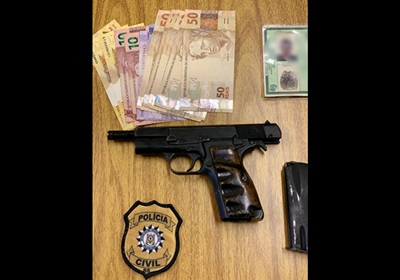 Hoje, durante a captura, foram realizadas buscas na residência onde ele se encontrava e foi localizada uma pistola calibre .9 mm com numeração suprimida. Segundo a polícia, ele fazia uso de identidade falsa, também de Santa Catarina.