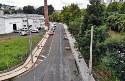 A Beira-Rio Chaminé já está com mais da metade da distância do passeio concluída. A colocação de pavers vai facilitar a circulação de pedestres ao longo das ruas Victor Meirelles e Irmão Guido Gabriel. Inspirada na Beira-Rio da Aristiliano Ramos, o local receberá passeios, decks e iluminação.