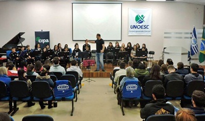 Os alunos do projeto Caçador de Músicos, da Orquestra de Flauta Doce do município de Caçador realizaram uma apresentação para alunos e professores da Unoesc Capinzal. A apresentação aconteceu no Auditório Doutor Vitor Almeida. Após a apresentação, aconteceu ainda uma palestra sobre saúde vocal, organizada pela CIPA e ministrada pela Fonoaudióloga Daniela Bortoli.