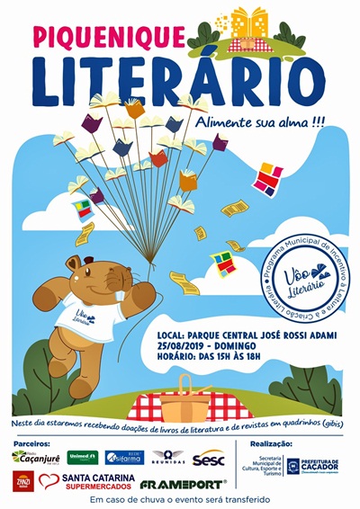 O Piquenique Literário acontece neste domingo, 25 de agosto, em Caçador. A ação faz parte do programa municipal de incentivo a leitura e a criação literária da Prefeitura de Caçador. Toda a comunidade está convidada a participar, a partir das 15h.