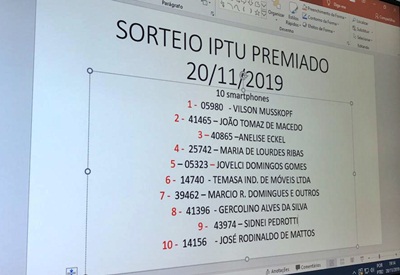 O sorteio dos 10 primeiros smartphones da promoção IPTU Premiado da Prefeitura de Caçador, aconteceu nesta quarta-feira, 20 de novembro. Esta é a segunda edição da promoção, onde aqueles que pagarem o IPTU em dia ganham cupons para participar do sorteio.