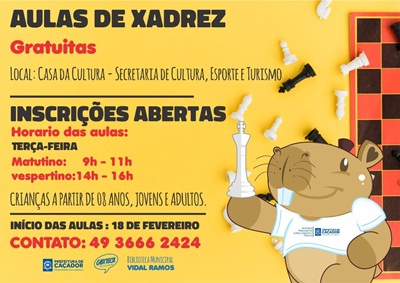 As inscrições para as escolinhas gratuitas de xadrez, oferecidas pela Prefeitura de Caçador, estão abertas. As aulas iniciam em 18 de fevereiro.