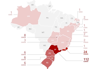 No relatório, São Paulo é o estado com o maior número de casos confirmados, com 112. Isso representa 63,6% de todos os casos no país. O Rio de Janeiro é o segundo estado com mais casos, com 24.