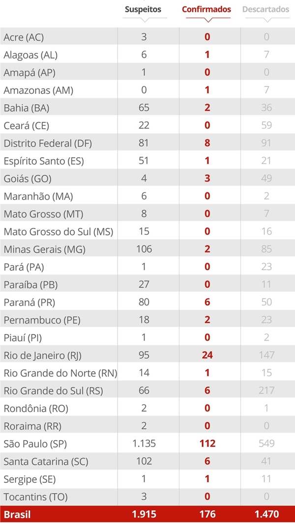 No sábado eram 121, no balanço deste domingo já são 176 confirmados no país. Santa Catarina tinha três, agora tem seis