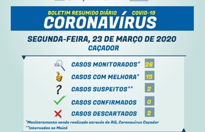 Até este domingo, 22, havia um caso suspeito, que foi descartado. Além disso, 26 estão sendo monitorados pelo “Alô, Coronavírus Caçador” e estão com sintomas de doenças respiratórias. 15 dos que estavam sendo monitorados anteriormente já tiveram melhora. Ao todo, o sistema recebeu, nesta segunda-feira, 149 contatos.
