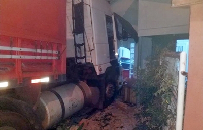 A carreta atingiu um veículo de passeio que estava na garagem da residência, fazendo com que o mesmo quebrasse a parede e invadisse a cozinha.