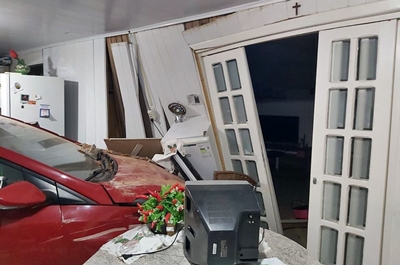 O veículo atingiu um carro de passeio que estava na garagem, fazendo com que o mesmo quebrasse a parede e invadisse a cozinha