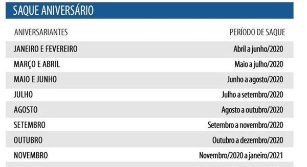 O trabalhador que nasceu em março, por exemplo, ainda pode optar pelo saque-aniversário do FGTS, mas não receberá o dinheiro este ano. O prazo limite para ele aderir à modalidade e efetuar o saque em 2020 terminou nesta terça-feira, dia 31 de março. Já as pessoas nascidas em abril podem se inscrever até o dia 30.