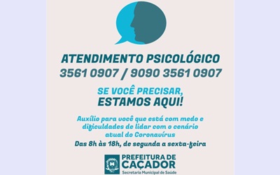 A Prefeitura de Caçador está iniciando, a partir desta quarta-feira, 8 de abril, um sistema de Atendimento Psicológico Online. O objetivo do canal é auxiliar aquelas pessoas que estão com medo e dificuldades de lidar com o cenário atual do Coronavírus.