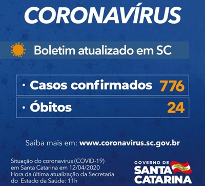 O Governo do Estado informou que há 776 casos confirmados de Covid-19 em Santa Catarina e 24 mortes causadas pelo novo coronavírus desde o início da pandemia. Os dados são do boletim atualizado neste domingo, 12 de abril.