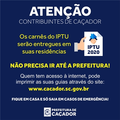 Os carnês do IPTU 2020 serão entregues nos endereços dos contribuintes, não havendo necessidade dos cidadãos irem até a Prefeitura para retirar as guias. A orientação é para que todos fiquem em casa e só saiam em caso de necessidade extrema.
