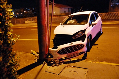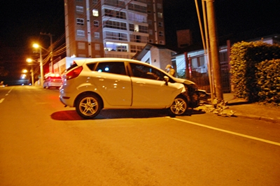 Um Ford Fiesta bateu forte contra um poste na noite desta sexta-feira, 17 de abril, na Rua Olavo Bilac, no Bairro Paraíso, em Caçador. O acidente aconteceu por volta das 11h55min.