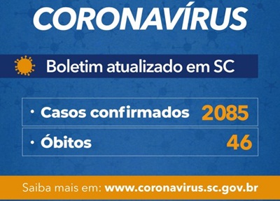 O Governo do Estado informou que há 2.085 casos confirmados de infecção pelo novo coronavírus em Santa Catarina. O dado foi divulgado por meio de entrevista coletiva nesta quarta-feira, 29, concedida pelo governador Carlos Moisés. A Covid-19 já causou 46 mortes no estado desde o início da pandemia. Os dois registros mais recentes são de homens moradores de Concórdia e Ituporanga, de 46 e 61 anos, respectivamente. Ambos faziam parte dos grupos de risco.