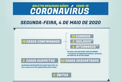 No boletim desta segunda-feira, há também a informação de mais uma pessoa curada: ela estava internada no Maicé e recebeu alta. Por isso, são 18 casos confirmados, mas 12 pessoas já curadas. Três são os casos suspeitos e, 22 descartados.