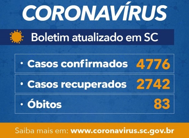 Santa Catarina chegou a 4.776 pacientes com confirmação de infecção pelo novo coronavírus. O número foi divulgado pelo Governo do Estado neste domingo, 17. Desse total, 2.742 já se recuperaram e 1.951 estão em acompanhamento. Desde o início da pandemia, 83 mortes foram causadas pela Covid-19. A taxa de letalidade é de 1,74%.