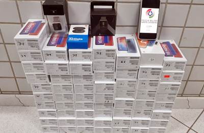 Após a revista veicular foram localizados 61 aparelhos smartphones, e acessórios eletrônicos, todos produto do crime de descaminho, onde o condutor do veículo não possuía nota fiscal de nenhum dos itens encontrados.