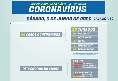 Vigilância Epidemiológica de Caçador informou em seu boletim diário, neste domingo, 7 de junho, que houve um aumento de 4 casos confirmados de Covid-19, em relação ao dia anterior, chegando a 50 no total. Até o momento o município já recuperou 36 pessoas e registrou apenas um óbito.