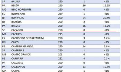 Em Santa Catarina, foram mais 5 cidades contempladas com a pesquisa: Blumenau (1 caso identificado); Chapecó (nenhum caso identificado); Florianópolis (nenhum caso identificado); Joinville (nenhum caso identificado); Lages (nenhum caso identificado).