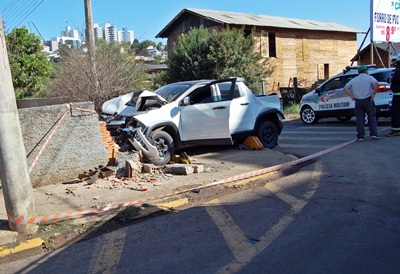 Com a força da colisão, a caminhonete foi projetada contra o muro de uma residência, e ficou bastante destruída