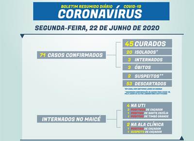 - 71 casos confirmados: 45 estão curados; 20 isolados em casa; 3 internados no Maicé; 3 foram a óbito (1 homem, 66 anos; 1 mulher, 87 anos; e 1 homem, 89 anos).