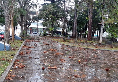 Na Praça Nossa Senhora Aparecida, assim como em outros pontos do centro, árvores foram desgalhadas e as ruas ficaram cheias de folhas e galhos.