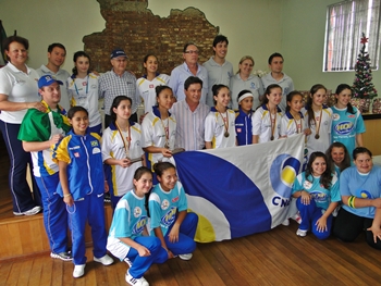 As campeãs escolares sulamericanas de futsal feminino da Kindermann/Marcos Olsen desfilaram em carro aberto nesta sexta-feira (9) em Caçador após a conquista do título na Colômbia e foram recepcionadas para um coquetel pelo secretário de Estado do Desenvolvimento Regional, Beto Comazzetto.