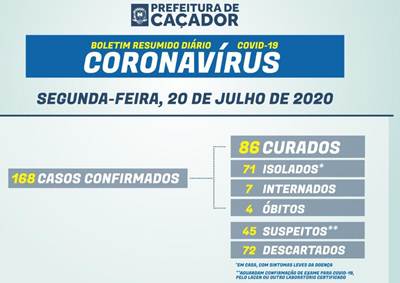 Em resumo, Caçador hoje tem: 168 casos confirmados: 86 estão curados; 71 isolados em casa; 7 internados no Maicé; 4 foram a óbito (1 homem, 84 anos; 1 mulher, 87 anos; 1 homem, 89 anos; 1 homem, 51 anos).