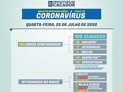 Em resumo, Caçador chega 195 casos confirmados, sendo 106 curados e 78 isolados em casa. Internados no Hospital Maicé são 7 pacientes. Conforme vem sendo divulgado, 4 pacientes foram a óbito (1 homem, 84 anos; 1 mulher, 87 anos; 1 homem, 89 anos; 1 homem, 51 anos).