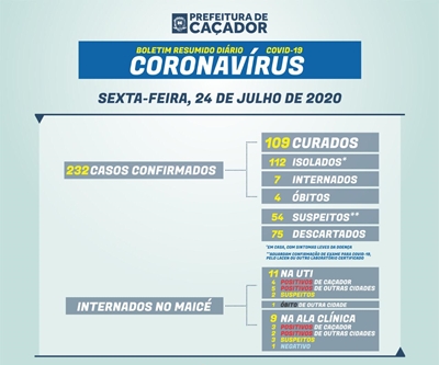 Em resumo, Caçador tem 232 casos confirmados: 109 estão curados; 112 isolados em casa; 7 internados no Maicé; 4 foram a óbito (1 homem, 84 anos; 1 mulher, 87 anos; 1 homem, 89 anos; 1 homem, 51 anos).