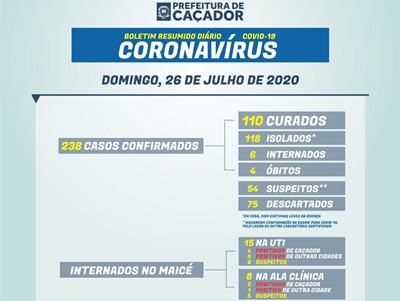 Em resumo: Caçador tem 238 casos confirmados: 110 estão curados; 118 isolados em casa; 6 internados no Maicé; 4 foram a óbito (1 homem, 84 anos; 1 mulher, 87 anos; 1 homem, 89 anos; 1 homem, 51 anos).