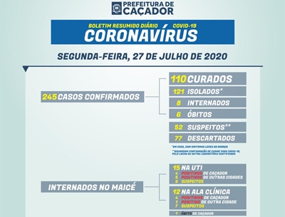 Em resumo: Caçador tem 245 casos confirmados de Covid-19, destes, 110 estão curados; 121 isolados em casa e 8 internados no Maicé. 6 pessoas já foram a óbito (1 homem, 84 anos; 1 mulher, 87 anos; 1 homem, 89 anos; 1 homem, 51 anos; 1 mulher, de 75 anos; 1 homem, de 66 anos).