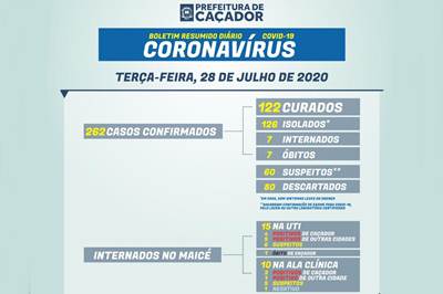 Em resumo: Caçador tem 262 casos confirmados. Destes, 122 estão curados; 126 isolados em casa; 7 internados no Maicé; 7 foram a óbito (1 homem, 84 anos; 1 mulher, 87 anos; 1 homem, 89 anos; 1 homem, 51 anos; 1 mulher, de 75 anos; 1 homem, de 66 anos; 1 mulher, de 80 anos).