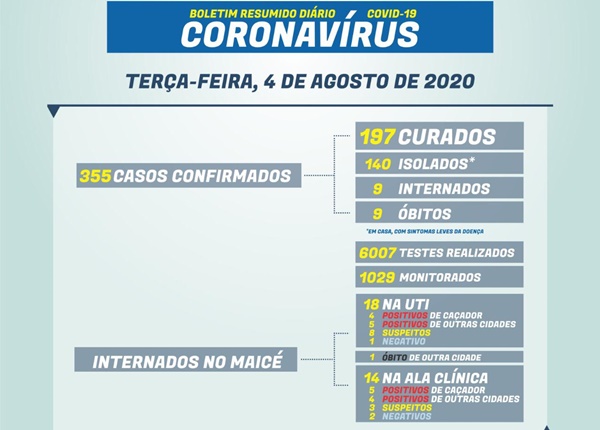Em resumo, Caçador tem 355 casos confirmados: 197 estão curados; 140 isolados em casa e 9 internados no Maicé. Já o número de óbitos ermanece o mesmo: 9 registros (1 homem, 84 anos; 1 mulher, 87 anos; 1 homem, 89 anos; 1 homem, 51 anos; 1 mulher, de 75 anos; 1 homem, de 66 anos; 1 mulher, de 80 anos; mulher, 91 anos; homem, 81 anos, que estava morando em Florianópolis, mas ainda mantinha carteira de Saúde de Caçador).