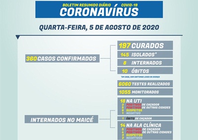 Caçador registrou mais 1 óbito nesta quarta-feira, 5 de agosto. Trata-se de homem, 41 anos, que estava internado no Maicé. Além disso, 5 novos casos foram registrados, aumentando o total para 360.