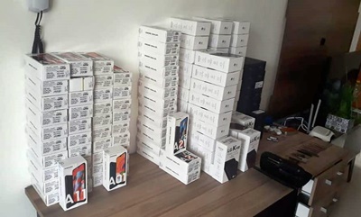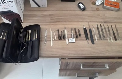 Em continuidade, os policiais deslocaram até a residência do homem abordado, onde no interior da casa foram encontradas mais chaves michas, alicates, capas de alumínio, cimento expansivo utilizado pra quebrar paredes e vários outros objetos utilizados para arrombamentos, também foram encontrados produtos de furto e cerca de 150 aparelhos celulares, número compatível com aparelhos que foram furtados recentemente em uma loja de Irati no Paraná.