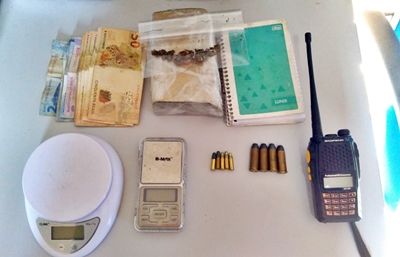 Na residência do elemento foi localizado aproximadamente meio quilo de maconha, duas balanças digitais, dinheiro em espécie, anotações referentes à venda de droga, nove munições (5 do calibre .22 e 4 do calibre .44) e um rádio transceptor sintonizado na frequência da Polícia Militar local.