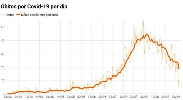 Desde o dia 1º de agosto, data em que ocorreram 53 óbitos causados pela Covid-19 em Santa Catarina, o estado apresenta trajetória de queda no número diário de mortes decorrentes do coronavírus. A média dos últimos sete dias, contados até esta quinta-feira, 3, é de 23 óbitos. A taxa de letalidade catarinense, de 1,27%, é a menor do Brasil e está abaixo da maioria dos países desenvolvidos.