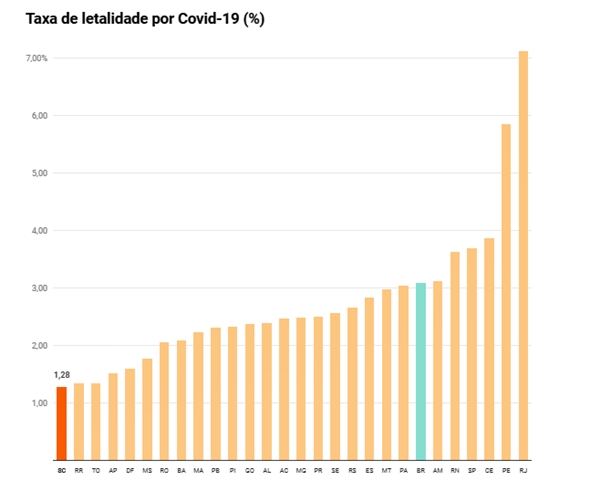 A taxa de letalidade catarinense, de 1,27%, é a menor do Brasil e está abaixo da maioria dos países desenvolvidos