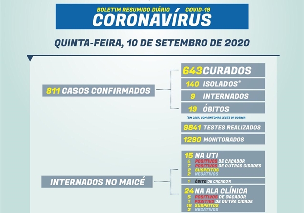 Mais um óbito causado pela Covid-19 foi registrado, em Caçador. O paciente tinha 70 anos e estava internado no Maicé desde o dia 23 de agosto.