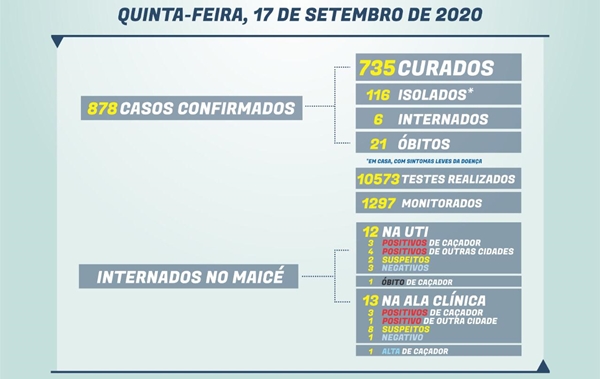 Na Ala Clínica (isolamento), há 13 pacientes internados (do total de 32 leitos): 4 confirmados (3 de Caçador e 1 de outra cidade), 8 suspeitos e 1 negativo.