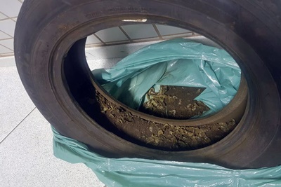 Após buscas no interior do veículo, foi encontrado cerca de 1,5 Kg de substância análoga a maconha dentro de um pneu que estava no porta malas do veículo. Segundo o homem que estava dirigindo o carro este pneu estava rodando quando acabou furando, sendo substituído pelo pneu estepe.