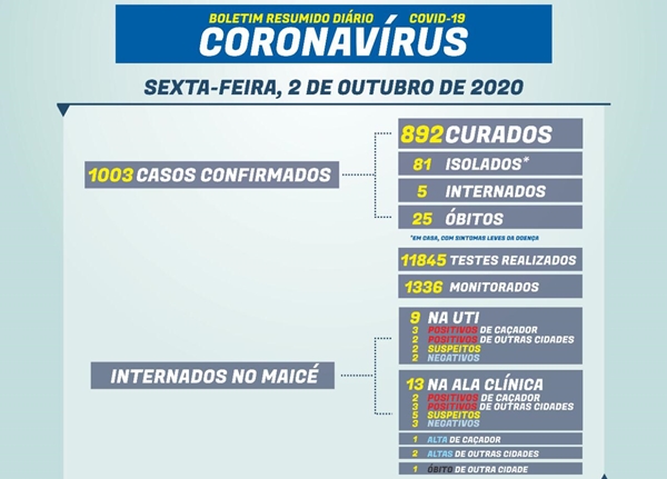 O município de Caçador chegou nesta sexta-feira, 2 de outubro á 1003 casos de infecção causado pelo coronavírus. Deste total, 88,9% já estão curados da doença.