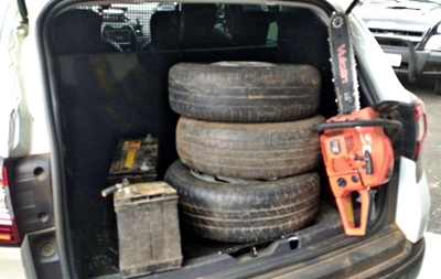 Durante as buscas na residência, os policiais localizaram em baixo da cama do casal, duas baterias da marca Pioneiro, ambas com as características das que haviam sido furtadas das máquinas da prefeitura. Além disso, foi encontrado uma motosserra marca Vulcan, bem como quatro rodas com pneus, cujos objetos os moradores não souberam explicar a procedência.