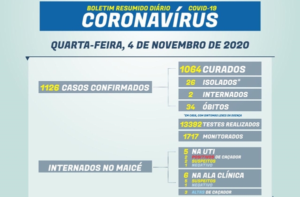 - 1126 casos confirmados: 1064 estão curados; 26 isolados em casa; 2 internados no Maicé