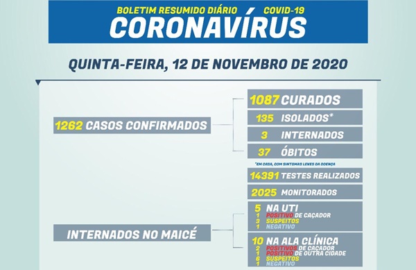 - 1262 casos confirmados: 1087 estão curados; 135 isolados em casa; 3 internados no Maicé