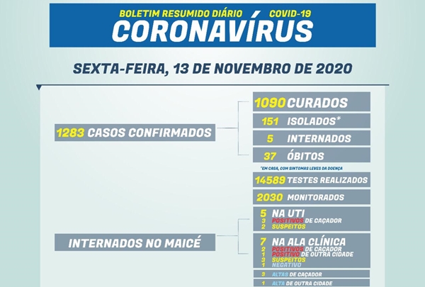 Nesta sexta-feira, 13 de novembro, a Vigilância Epidemiológica de Caçador informou que curou mais 3 pacientes que estavam diagnosticados com a Covid-19. No entanto, em relação ao dia anterior, 18 novos casos foram confirmados, elevando o total de casos ativos para 156.